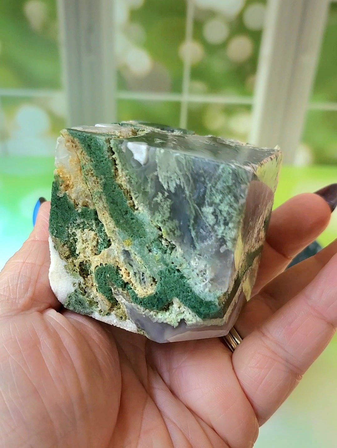 Moss Agate is believed to bring a calming and grounding energy in order to help balance extreme emotions. This stone is thought to help release fear and anxieties, providing space for self-growth. It is said to enhance the individual's self-esteem and encourage positive interpersonal relationships.